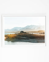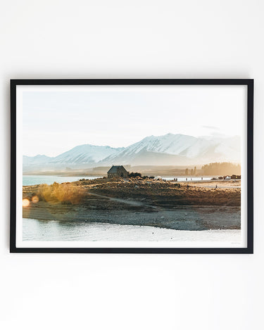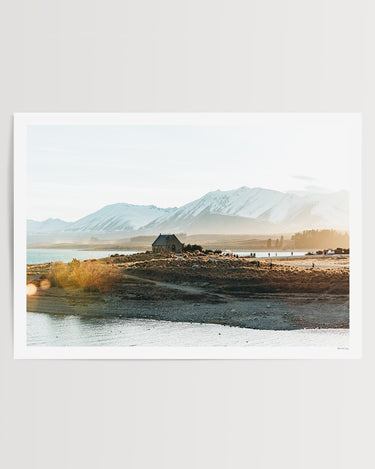 This stunning art print captures the historic Church of the Good Shepherd bathed in the soft, warm glow of a Mackenzie Basin sunset.