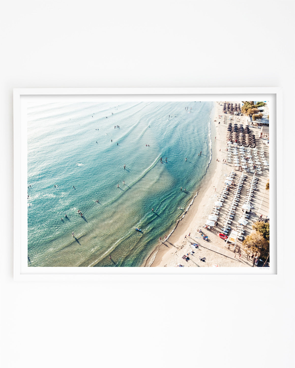 Above Naxos Shores captures the island’s iconic coastline from above - turquoise waters, soft sandy beach, and neatly scattered umbrellas forming beautiful patterns along the shore. Bring Mediterranean summer into any interior.