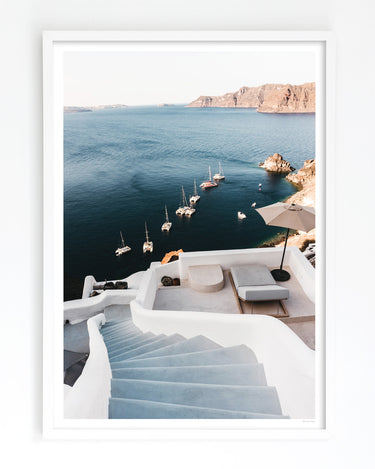 Shot from the cliffs of Santorini overlooking the deep blue expanses of the Aegean Sea. Perfect for interiors wanting a Greek island escape.